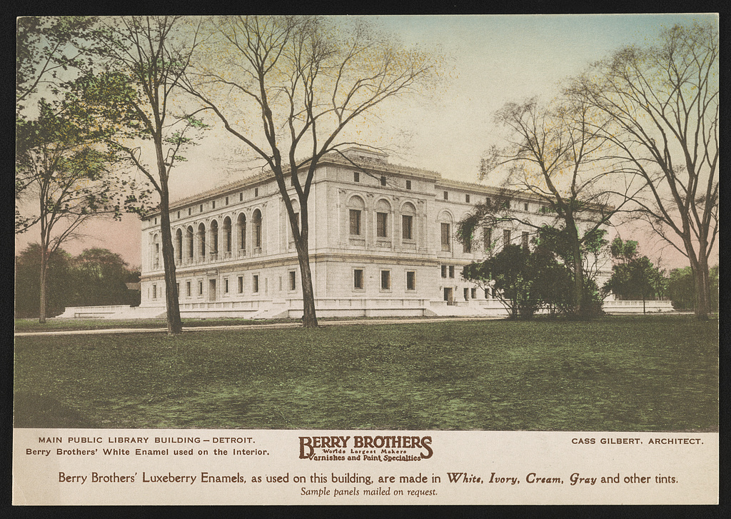 - Photograph shows view of Carnegie Library in Detroit, Michigan. Title from item. Includes advertisement for Berry Brothers, varnishes and paint specialties. Library designed by Cass Gilbert.