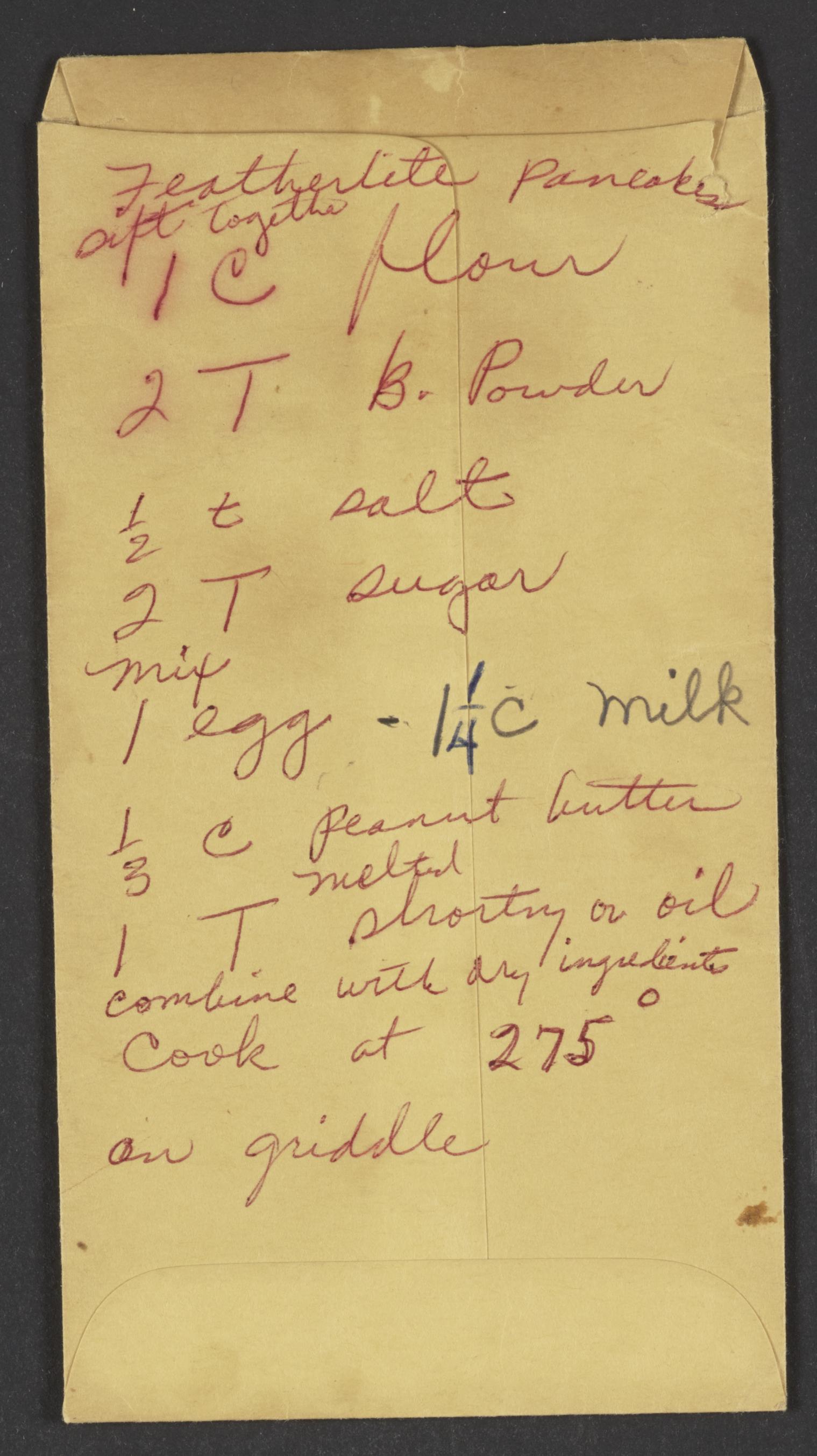 - Recipe for featherlite pancakes, undated, written on the back of a money envelope from First Indepedence National Bank of Detroit [Detroit, Mich]. From the Rosa Parks Papers: Miscellany, 1934-2005.